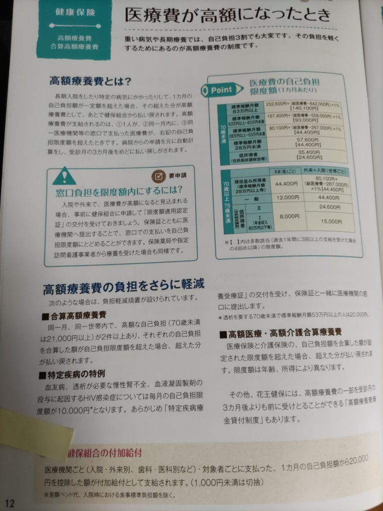 写真は少し映りが悪いですが、私がいた会社の健康保険の案内です。実は高額の医療がかかったときの一時的な負担の割合は、大手企業の組合健保、小規模企業の協会健保、国民健康保険も同じ表です。右上の図表の通りで、普通に月給貰う人で月57,600円とか、少し貰うのが増えると80,100、もっと稼ぐと16万~とかに上がり、非課税世帯でも月35,400円の負担はあります。これは共通の金額で、窓口での一時負担を避けるには事前に限度額認定証の発行ができます。入院時の食事代は別ですし、差額ベッドや保険適用外の高度先端医療も当然別です。